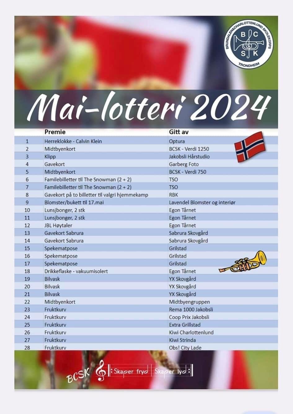 Finfine premier i korpset sitt mai-lotteri. 20 kroner per lodd. Enkelt med vipps. Trekkes 16. mai.